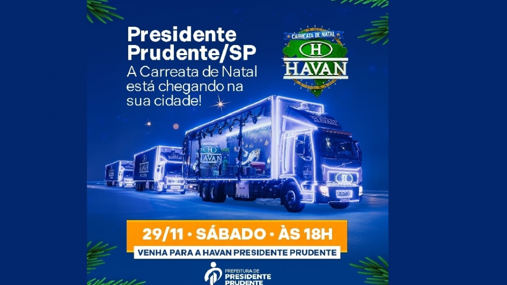 Presidente Prudente está definitivamente em clima de Natal. No próximo sábado, dia 29 de novembro, a cidade recebe a Carreata de Natal da Havan, um desfile iluminado que promete encantar pessoas de todas as idades. A programação começa às 18h, no estacionamento da loja, onde o público poderá aproveitar o Papai Noel, antes da saída das carretas. O convite foi feito pela Havan à Secretaria Municipal de Turismo, para que a cidade estivesse no cronograma da carreata.