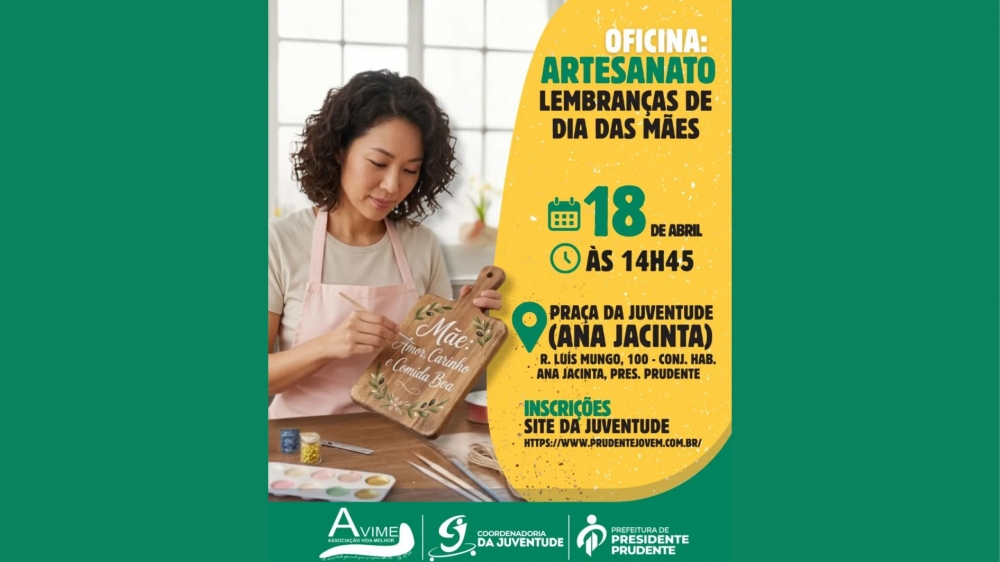A Coordenadoria Municipal da Juventude de Presidente Prudente, em parceria com a Avime - Associação Vida Melhor, informa que estão abertas as inscrições para a oficina especial de artesanato, com foco na produção de lembranças criativas para o Dia das Mães.