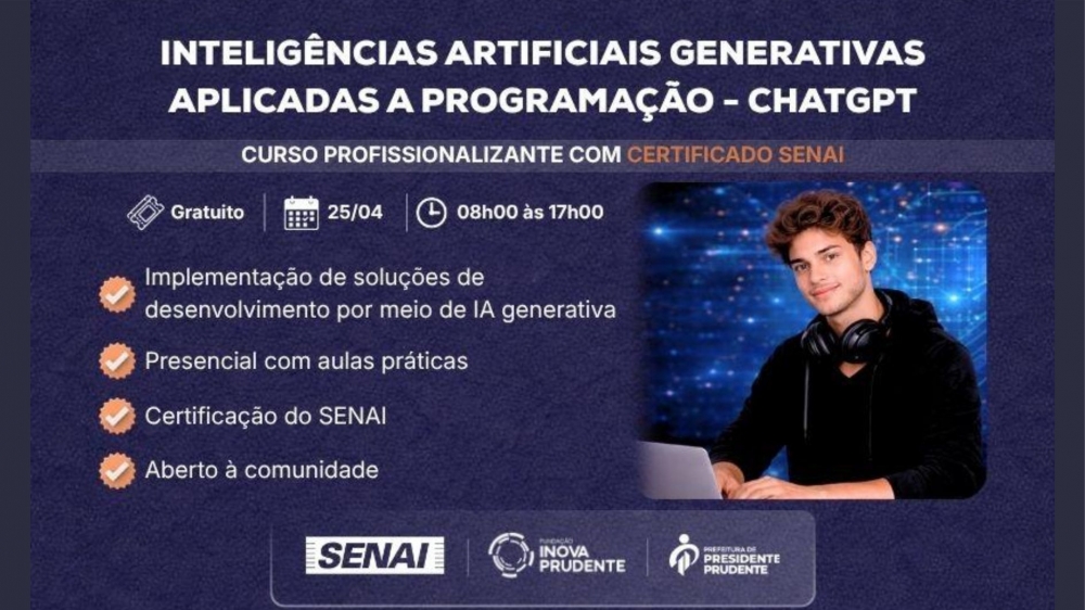 Estão abertas as pré-inscrições para o curso gratuito de Aperfeiçoamento Profissional de Inteligências Artificiais Generativas Aplicadas a Programação (ChatGPT). Os alunos aprenderão a implementar soluções de desenvolvimento com IA generativa, com foco na utilização do ChatGPT como ferramenta assistente, para criação de um chatbot (software que simula conversas por texto ou voz), que atenda as principais necessidades do mercado.