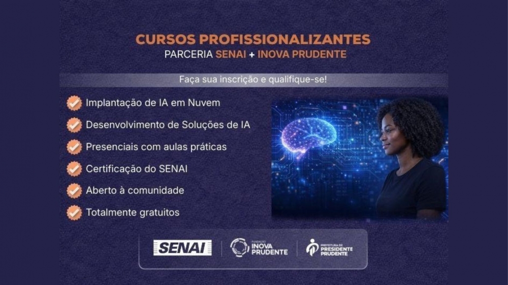 A Inova Prudente e o Senai informar que estão abertas as pré-inscrições para os cursos gratuitos de Implantação de Serviços de Inteligência Artificial em Nuvem e Desenvolvimento de Soluções em Inteligência Artificial. Os interessados podem se candidatar pelo formulário online.