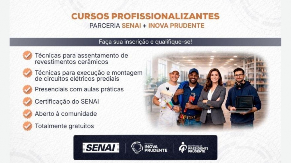 Estão abertas as pré-inscrições para os cursos gratuitos de Técnicas para Execução e Montagem de Circuitos Elétricos Prediais e Técnicas para Assentamento de Revestimentos Cerâmicos, marcando mais uma parceria entre a Fundação Inova Prudente e o Serviço Nacional de Aprendizagem Industrial (Senai).