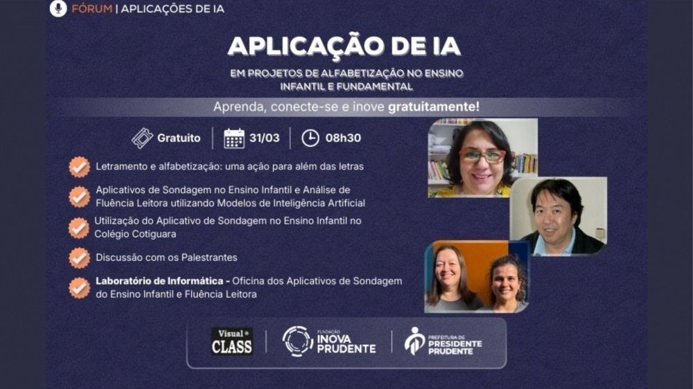 A Inova Prudente receberá o Fórum de Aplicações de IA (Inteligência Artificial) em Projetos de Alfabetização no Ensino Infantil e Fundamental, gratuitamente, no dia 31 de março (terça-feira), onde serão apresentados os aplicativos de Sondagem do Ensino Infantil e Análise de Fluência de Leitura desenvolvidos com modelos de Inteligência Artificial pela Caltech Informática.
