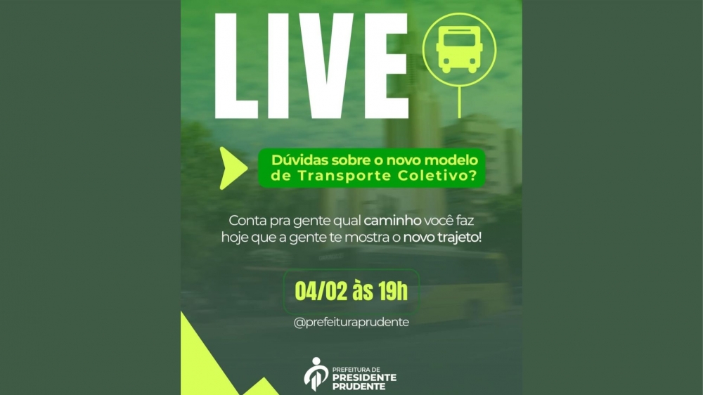 A Prefeitura de Presidente Prudente, por meio da Secretaria Municipal de Mobilidade Urbana e Cooperação em Segurança Pública (Semob), irá promover uma live nesta quarta-feira (04/02), às 19h, por meio do Instagram oficial @prefeituraprudente para orientar a população sobre o novo sistema de transporte coletivo.
