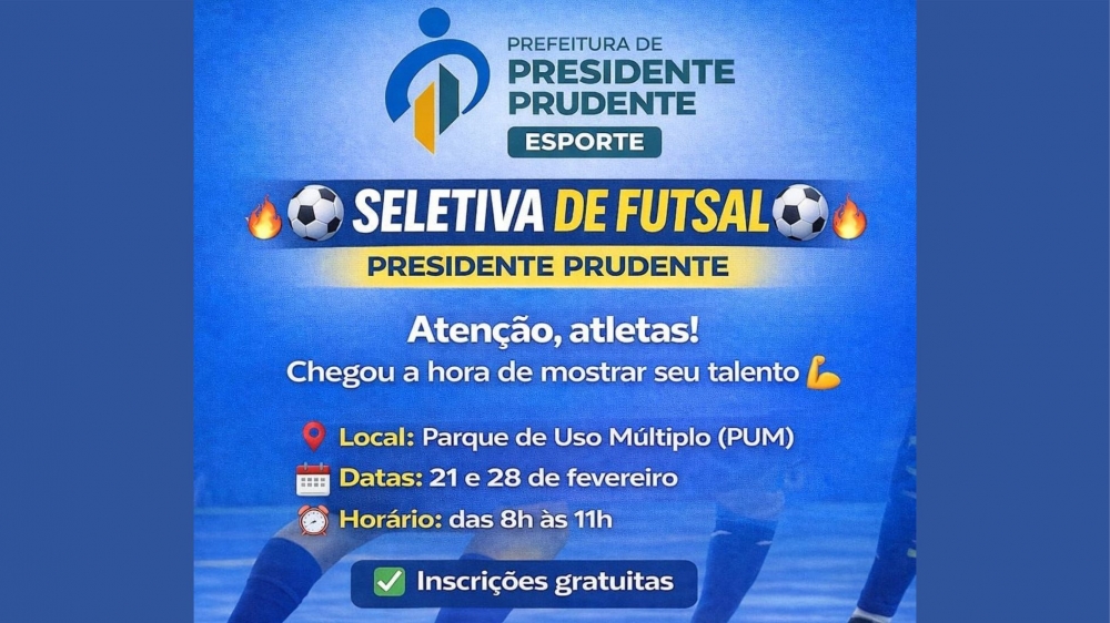 A Prefeitura de Presidente Prudente, por meio da Secretaria Municipal de Esporte (Semepp), realizará nos dias 21 e 28 de fevereiro as Seletivas de Futsal Masculino. As avaliações ocorrem das 8h às 11h, no Parque de Uso Múltiplo (PUM) e é aberta para atletas nascidos nos anos de 2008 a 2011.