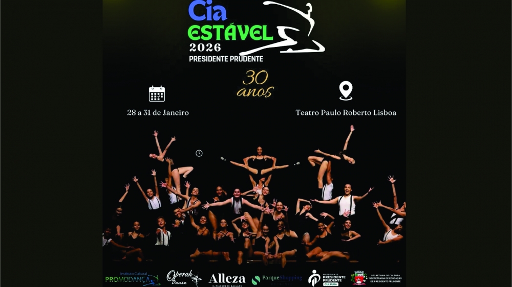 O Teatro Paulo Roberto Lisboa, da Secretaria Municipal de Cultura de Presidente Prudente (Secut), recebe a Cia Estável 2026, com grandes apresentações artísticas para o público, de 29 a 31 de janeiro, e entrada solidária, apenas 1 kg de alimento não perecível, itens que serão revertidos a entidades assistenciais.