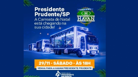 Carretas da Havan levam a magia do Natal às ruas de Prudente sábado no sábado (29) 24/11/2025 Carretas da Havan levam a magia do Natal às ruas de Prudente sábado no sábado (29)